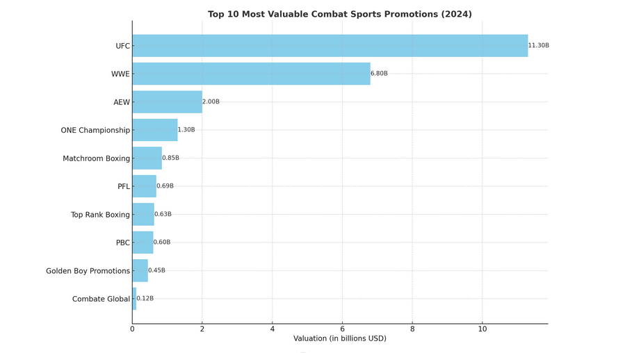 Incredibly, the UFC has blown its competitors out of the water when it comes to its value. Valued at 11.3 billion USD, no other fighting promotion comes close.